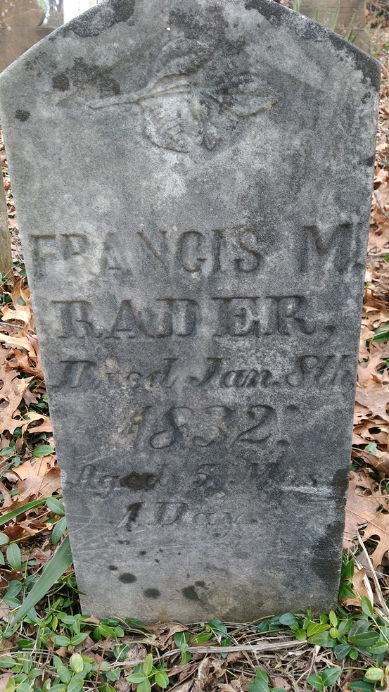 - Frances M. Rader died on January 8th, 1832 aged 5 months and 1 day, and is buried in Brick Union Cemetery.