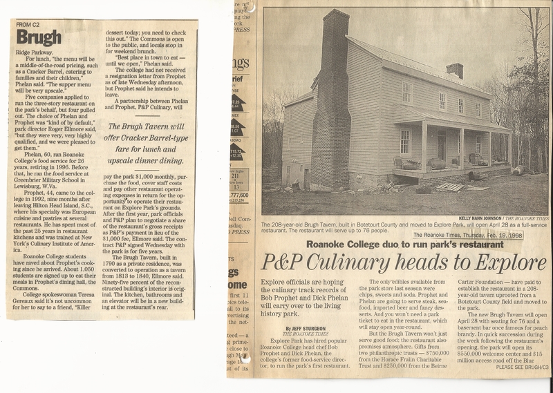 - Image 3 - Newspaper article from the Roanoke Times, dated February 19, 1998, titled, "Roanoke College duo to run park's restaurant: P & P Culinary heads to Explore," by Jeff Sturgeon