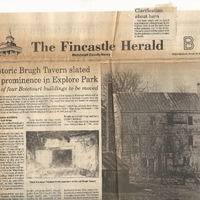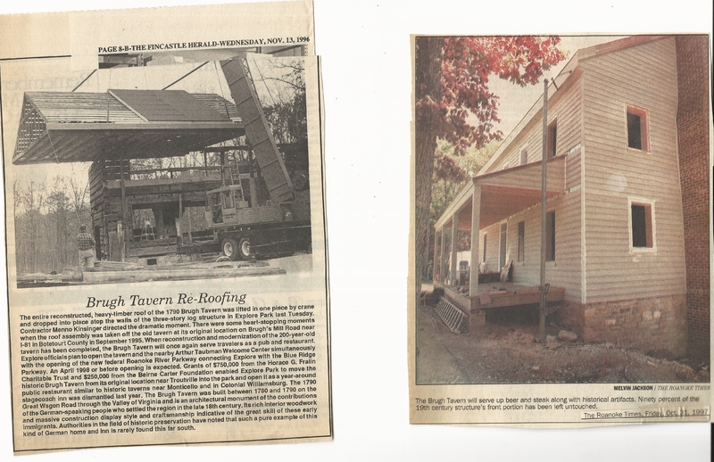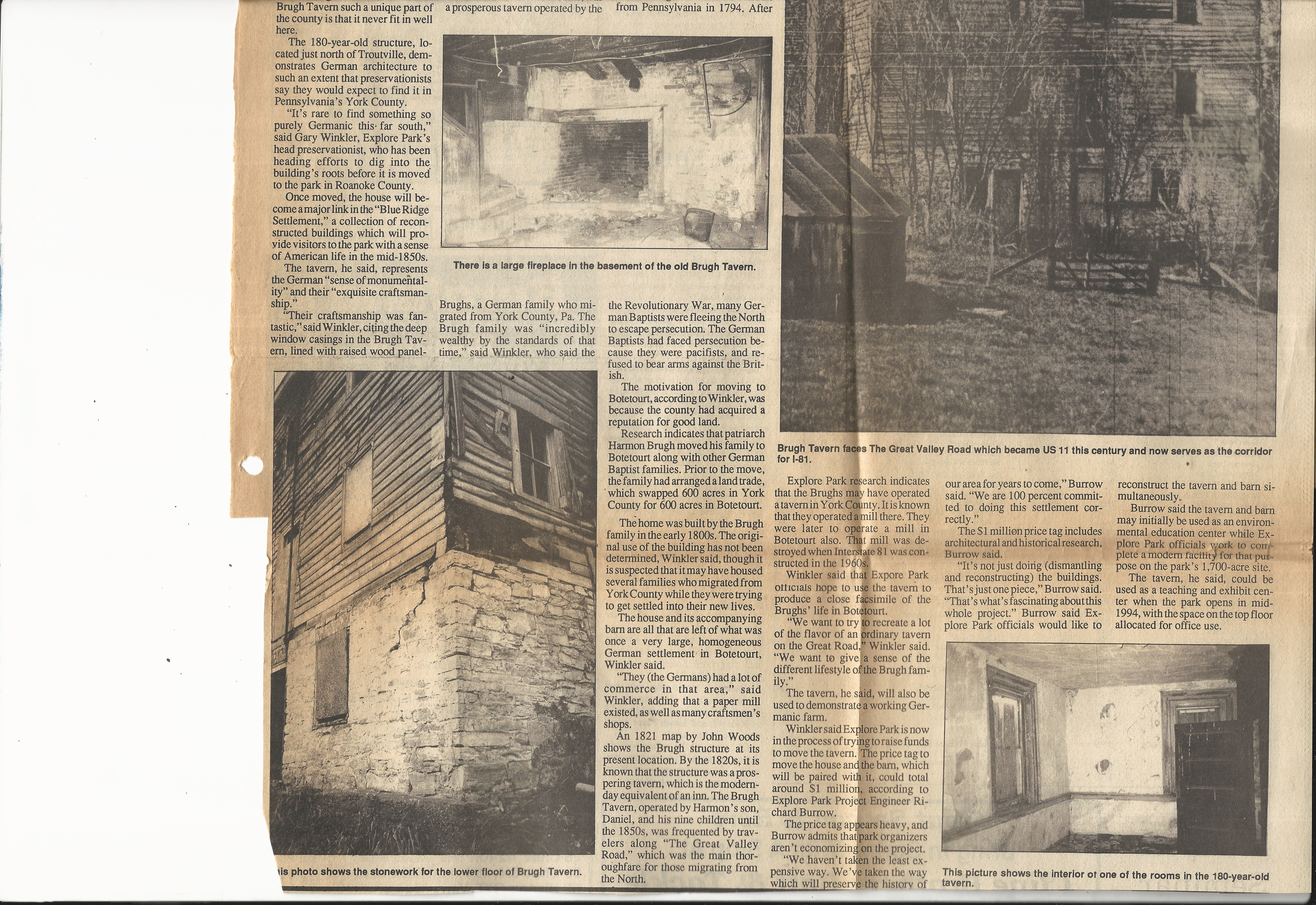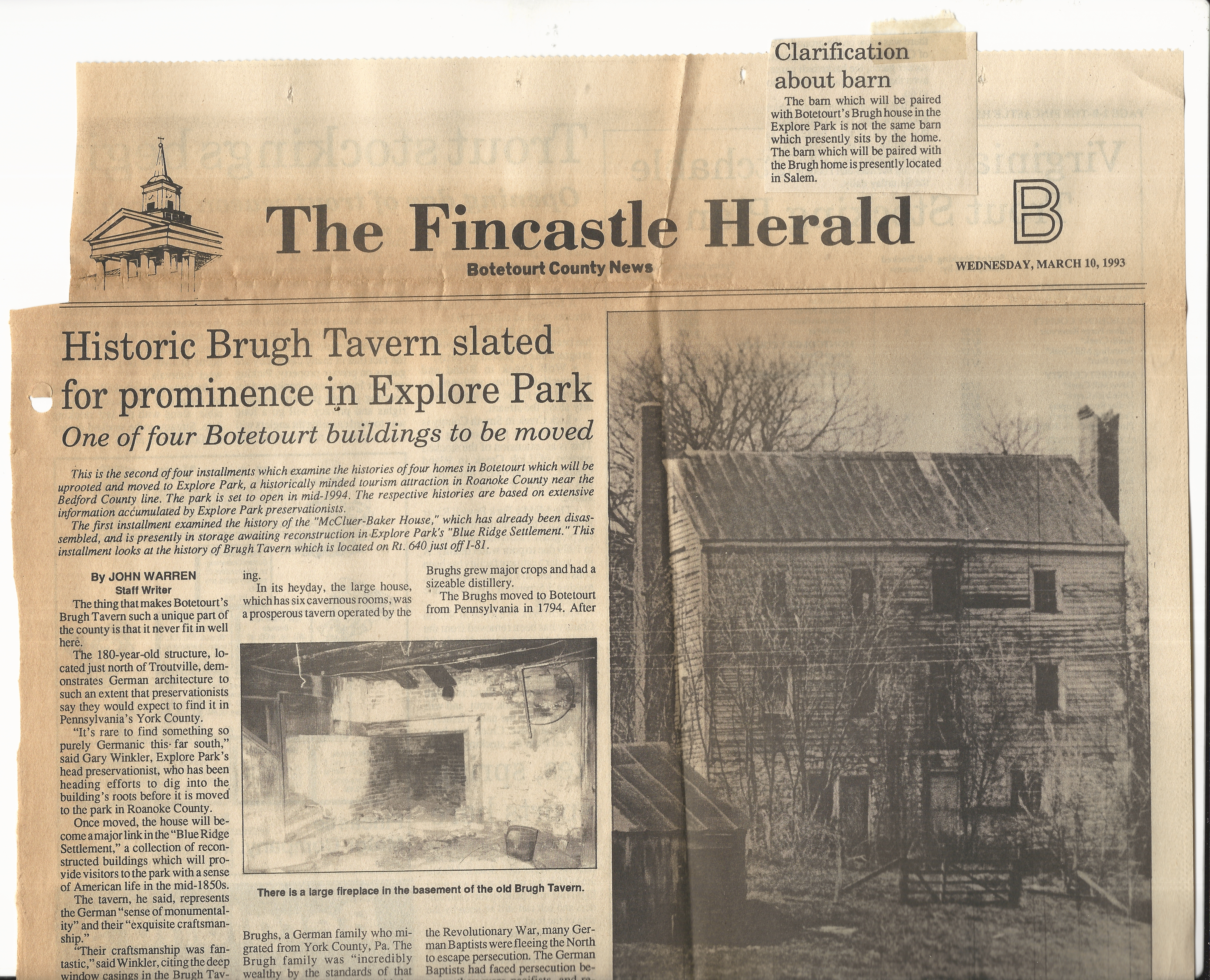 - Images 1-2 - Newspaper article from the Fincastle Herald dated March 10, 1993, titled "Historic Brugh Tavern slated for prominence in Explore Park: One of four Botetourt buildings to be moved" by John Warren