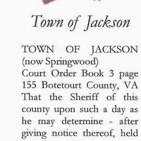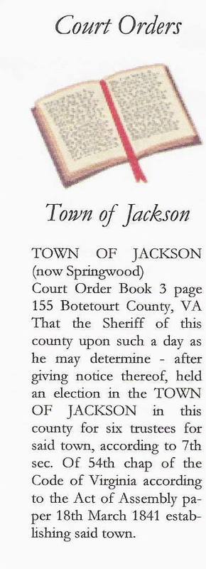 Court Order Book 3 page 155 Botetourt County, VA That the Sheriff of this county upon such a day as he may determine - after giving him notice thereof, held an election in the TOWN OF JACKSON in this county for six trustees for said town, according to 7th sec. Of 54th chap of the Code of Virginia according to the Act of Assembly paper 18th March 1841 establishing said town." -