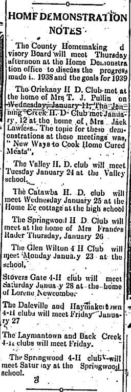 Home Demonstration Notes, Springwood, 1-19-1939, Fincastle Herald