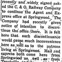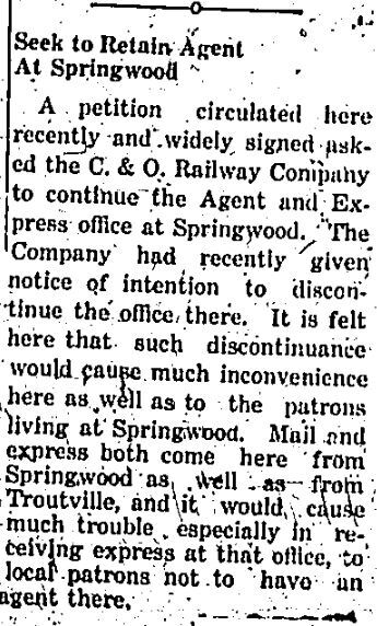 A petition circulated here recently and widely signed asking the C. & O. Railway Company to continue the Agent and Express office at Springwood. The Company had recently given notice of intention to discontinue the office there. It is felt here that such discontinuance would cause much inconvenience here as well to the patrons living at Springwood. Mail and express both come here from Springwood as well as from Troutville, and it would cause much trouble especially in receiving express at that office, to local patrons not to have an agent there." -