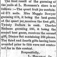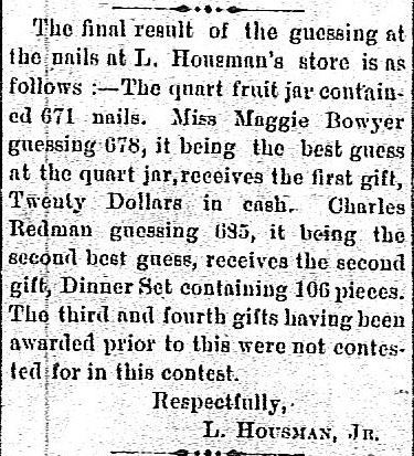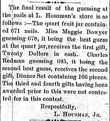 "The final result of the guessing at the nails at L. Housman's store is as follows :- The quart fruit jar contained 671 nails. Miss Maggie Bowyer guessing 678, it being the best guess at the quart jar, receives the first gift, Twenty Dollars in cash. Charles Redman guessing 695, it being the second best guess, receives the second gift, Dinner Set containing 106 pieces. The third and fourth gifts having been awarded prior to this were not contested for in this contest.