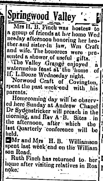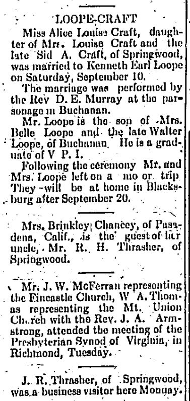 Loope & Craft wedding and other Springwood news 9-15-1938 Fincastle Herald