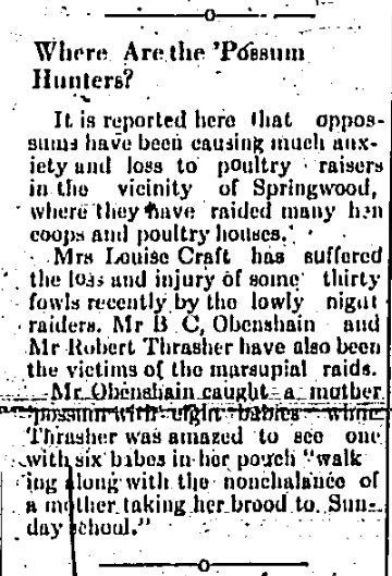 It is reported here that oppossums [sic] have been causing much anxiety and loss to poultry raisers in the vicinity of Springwood, where they have raided many hen coops and poultry houses.