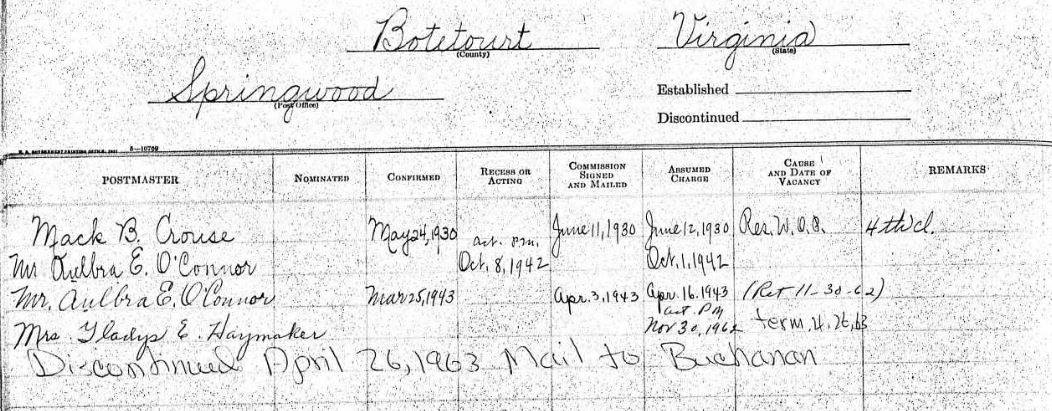 - Image 12 - A list of the Springwood Post Office postmasters, including Mack B. Crouse, Mr. Aulbra E. O'Connor, and Mrs. Gladys E. Haymaker. It notes the post office was discontinued April 26, 1963.