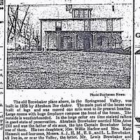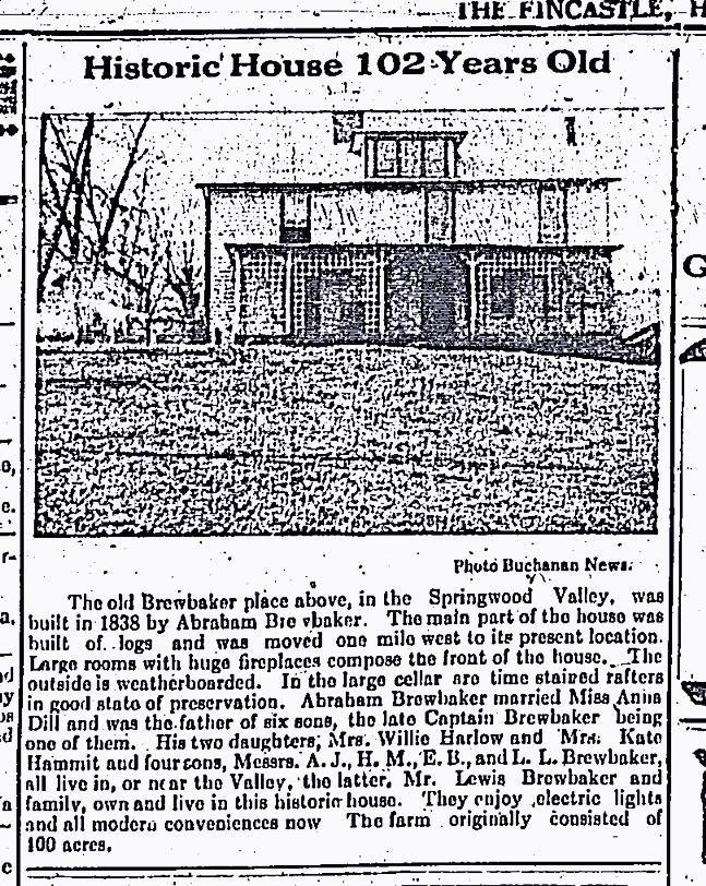 The old Brewbaker place above, in teh Springwood Valley, was built in 1838 by Abraham Brewbaker. The main part of the house was built of logs and was moved one mile west to its present location. Large rooms with huge fireplaces compose the front of the house. The outside is weatherboarded. In the large cellar are time stained rafters in good state of preservation. Abraham Brewbaker married Miss Anna Dill and was the father of six sons, the late Captain Brewbaker being one of them. His two daughters, Mrs. Willie Harlow and Mrs. Kate Hammitt and four sons, Messrs. A. J., H. M., E. B., and L. L. Brewbaker, all live in, or n ear the Valley, the latter, Mr. Lewis Brewbaker and family, own and live in this historic house. They enjoy electric lights and all modern conveniences now. The farm originally consisted of 100 acres. - Image 4 - A color photograph of a dilapidated home in Springwood.