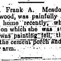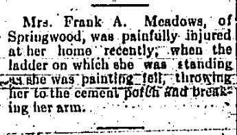 "Mrs. Frank A. Meadows, of Springwood, was painfully injured at her home recently, when the ladder on which she was standing as she was painting fell, throwing her to the cement patch and breaking her arm." -
