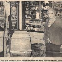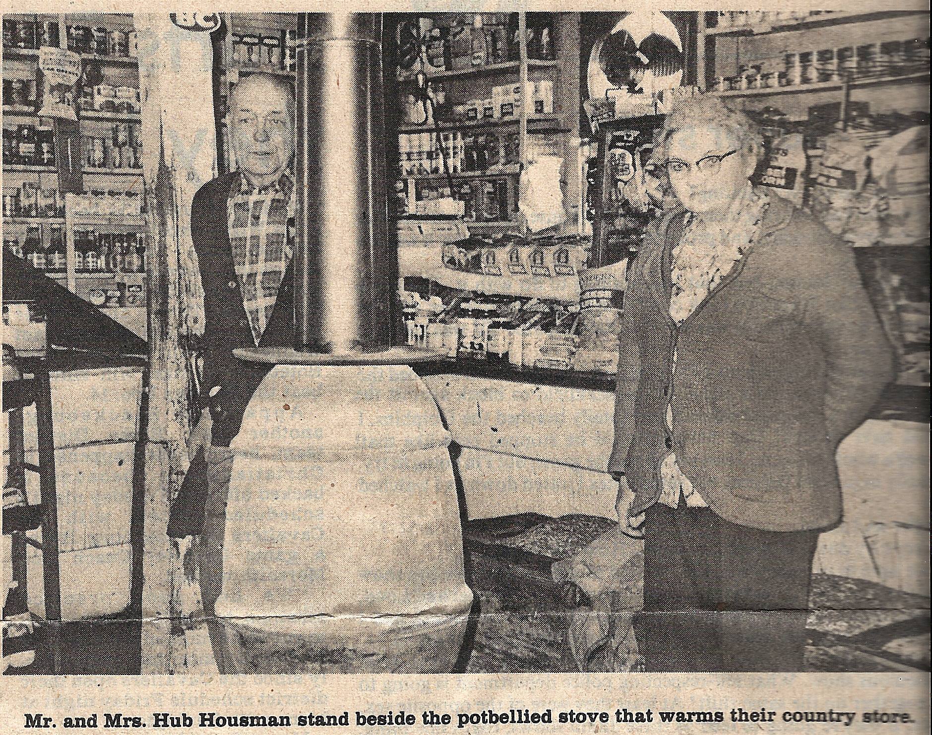 - Image 10 - A black and white photograph, with the caption, "Mr. and Mrs. Hub Housman stand beside the potbellied stove that warms their country store."