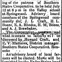 Farmers and their families are invited to attend the annual meeting of the patrons of Southern States Cooperative, to be held July 12 at 8 p. m. in the Valley school at Springwood. Advisory board members of the Springwood community are, J. L. Craft, H. L. Booze, E. A. Rhodes, H. M. Booze, and A. J. Brewbaker.