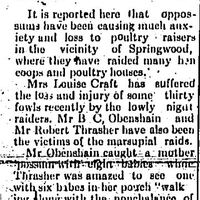 Mrs. Louise Craft has suffered the loss and injury of some thirty fowls recently by the lowly night raiders. Mr. B. C. Obenshain and Mr Robert Thrasher have also been the victims of the marsupial raids.