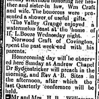 Homecoming day will be observing here Sunday at Andrew Chapel Dr. Sydenstricker will preach in the morning, and Rev A. B. Sites in the afternoon, after which the last Quarterly conference will be held.