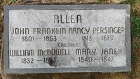 Allen, John Franklin, 1801-1863 John Franklin Allen was born in 1801. He married Nancy Persinger Allen. His children included William McDowell Allen, Mary Jane Allen, and Rebecca Elizabeth Allen. He died in 1863 and is buried in Allen-Carper Cemetery. His grave marker is shared between him, his wife, and his children William and Mary Jane.