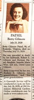 Patsel, Betty Gilmore, 1930 - 2020 Betty Gilmore Patsel was born in 1930. She married Robert E. Gilmore and Herman Patsel. She had three children: Jeanette Marie Wise, Rodney K. Gilmore, and David Lynn Gilmore. Betty Gilmore Patsel died on July 23, 2020, and is buried in Old Dominion Memorial Gardens. She lived in Roanoke.