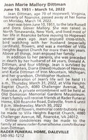 Dittman, Jean Marie Mallory, 1951 - 2022 Jean Dittman was born in 1951 to Russell and Doris Glover Mallory. She married Donald A. Dittman. They had two children, Diana Hudson and Katie Dittman. Jean Dittman died on March 14, 2022, and is buried in Old Dominion Memorial Gardens.