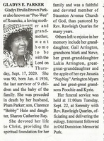 Parker, Gladys Etrulia Brown, 1930 - 2020 Gladys Etrulia Brown Parker, known as "Pee-Wee" was born on January 4, 1930. She married Plum Parker. They had two children, Clarence "Bobby" Hale and Sharon Catherine Ray. Gladys E. Parker died on September 17, 2020, and is buried in Old Dominion Memorial Park. she lived in Roanoke.