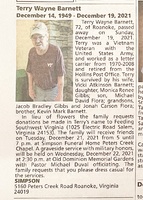Barnett, Terry Wayne, 1949 - 2021 Terry Wayne was born in 1949. He married Vicki Atkinson Barnett. They had two children, Monica Renee Gibbs and Michael David Flora. Terry Barnett died on December 19, 2021, and is buried in Old Dominion Memorial Gardens. He lived in Roanoke.