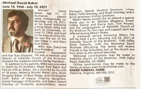 Baker, Michael David, 1950 - 2021 Michael Baker was born in Cloverdale in 1950 to Edgar C. and Mary Kyle Baker. He married Rebecca Shorter Baker. They had four children: Brian, Christopher, Jolane Flanagan, and Debra Overbay. Michael Baker died on July 19, 2021. He lived in Buchanan.