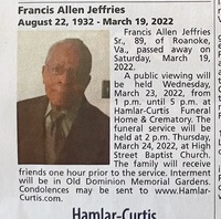 Jeffries, Francis Allen, 1932 - 2022 Francis Jeffries Sr. was born in 1932 to Charlie Jeffries and Annie Carter. He married Melva Dickerson Jeffries. They had seven children: Teresa David, Ricky, Francis Jr., Loretta Jeffries, Deborah Grigsby, Anessa Fugate, and Alana Martin. Francis Jeffries Sr. died on March 19, 2022, and is buried in Old Dominion Memorial Gardens. He lived in Roanoke.