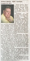 Garman, Robert Walter, 1936 - 2021 Robert Walter "Bob" Garman was born in 1936 in Salem, Virginia to Herman and Ruby Garman. He had three siblings: Alene, Barbara, and Curtis. He married Marlene on April 20, 1962. They had three children: Sharon, Lori, and Richard. Robert Garman died on August 22, 2021, and is buried in Old Dominion Memorial Gardens. He lived in Vinton.