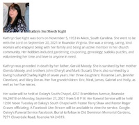 Kight, Kathryn Sue Moody, 1953 - 2021 Kathryn Kight was born in 1953 in Aiken, South Carolina to Gerald and Glenda Moody. She married Charley Kight. She had three children: Roxanne Lam, Jennifer Cleveland, and Mary Doran. Kathryn Kight died on September 20, 2021, and is buried in Old Dominion Memorial Gardens. She lived in Roanoke.