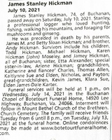Hickman, James Stanley, 1947 - 2021 James Hickman was born in 1947 to James M. and Betty Sloan Hickman. He married and divorced Katherine Sue Crouch Hickman. He had four children: Todd Hickman, Michael Hickman, Karen Hickman Mosely, and James Hickman. He lived in Buchanan, died in 2021, and is buried at Mount Bethel Church of the Brethren Church Cemetery.