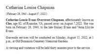 Chapman, Catherine Louise Evans Overstreet, 1940 - 2022 Catherine Chapman was born in 1940 to Gurney Evans and Verna Lloyde Evans. Catherine Chapman died on August 7, 2022, and is buried in Old Dominion Memorial Gardens.