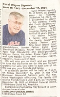 Sigmon, Eural Wayne, 1942 - 2021 Eural Sigmon was born in 1942 to Flossy and Eural. He married Doris. They had two children, Angela Pettus and Tina Noel. Eural Sigmon died on December 14, 2021, and is buried in Old Dominion Memorial Gardens. He lived in Salem.