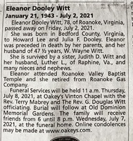 Witt, Eleanor Dooley, 1943 - 2021 Eleanor Dooley Witt was born on January 21, 1943 in Bedford County to Howard Lee and Julia F. Dooley. She married W. Wayne Witt. She is survived by a sister, Judith D. Witt. Eleanor Witt died on July 2, 2021, and is buried in Old Dominion Memorial Gardens.