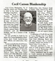 Blankenship, Cecil Carson, 1947 - 2022 Cecil Blankenship was born in 1947 in Roanoke to Otis Carson Blankenship and Joanna Bryant. He married Linda Dodd Blankenship. They had two children, Amanda Dillard and Jessica Graham. Cecil Blankenship died on June 9, 2022, and is buried in Goodwin Cemetery. He lived in Daleville.