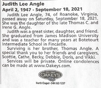 Angle, Judith Lee, 1947 - 2021 Judith Angle was born in 1947 to Thomas C. and Irene G. Angle. She died on September 18, 2021. She lived in Roanoke, and taught at Botetourt Intermediate School in Fincastle. She is buried in Fairview Cemetery in Roanoke.