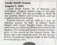 Frame, Linda Lee Smith, 1942 - 2021 Linda Smith Frame was born to Walter and Connie Smith. She married David Earl Frame. She had two sons, Tim Frame and Roy Frame. Linda Frame died on August 7, 2021, and is buried in Old Dominion Memorial Gardens.
