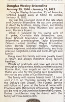 Brizendine, Douglas Wesley, 1946 - 2022 Douglas Brizendine was born in 1946 to Mack and Dorothy Brizendine. He married Charlotte Hale Brizendine. They had two children, Brian and Brad. Douglas Brizendine died on January 16, 2022, and is buried in Old Dominion Memorial Gardens. He lived in Roanoke.