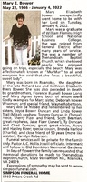 Bower, Mary Elizabeth, 1946 - 2022 Mary Bower was born in 1946 in Roanoke to Richard Lee and Kathleen Elizabeth Byers Bower. Mary Bower died on January 4, 2022, and is buried in Old Dominion Memorial Gardens.