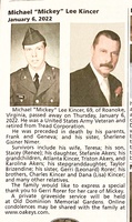 Kincer, Michael Lee, n.d. - 2022 Michael "Mickey" Lee Kincer was born to Frank and Geneva. He married Teresa. They had two children, Stacey and Stefanie Akers. Michael Kincer died on January 6, 2022, and is buried in Old Dominion Memorial Gardens. He lived in Roanoke.
