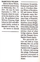 Wilson, Marcus Byron, 1983 - 2021 Marcus Wilson was born in 1983 in Roanoke to Richard and Vonnie Wilson. Marcus Wilson died on November 17, 2021, and is buried in Old Dominion Memorial Gardens.