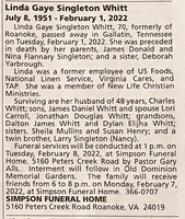 Whitt, Linda Gaye Singleton, 1951 - 2022 Linda Whitt was born in 1951 in Roanoke to James Donald and Nina Flannary Singleton. She married Charles Whitt. They had two children, James Daniel Whitt and Jonathan Douglas Whitt. Linda Whitt died on February 1, 2022, and is buried in Old Dominion Memorial Gardens.