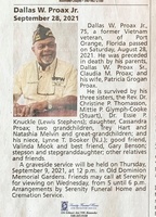 Proax, Dallas W, Jr., 1946 - 2021 Dallas Proax Jr. was born in 1946 to Dallas W. Proax Sr. and Claudia M. Proax. he married Patricia Grogan Proax. They had one child, Cassandra. Dallas Proax Jr. died on September 28, 2021, and is buried in Old Dominion Memorial Gardens. He lived in Port Orange, Florida.