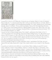 Tolley, Leonard W, Sr., 1929 - 2020 Leonard Witt Tolley, Sr. was born in Natural Bridge Station on July 21, 1929 to John L. and Kathleen Witt Tolley. He married Lorene Harless Tolley in 1960. They had four children: Leonard W. Tolley Jr., Susan T. Mayhew, Patricia T. Naff, and Mark S. Tolley. Leonard Tolley Sr. died on March 10, 2020, and is buried in Old Dominion Memorial Gardens. He lived in Daleville.