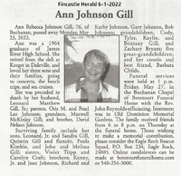 Gill, Ann R, 1945 - 2022 Ann Gill was born in 1946 to Oris M. and Pearl Lee Johnson. She married Leonard Matthew Gill, Sr. They had three children: Leonard, Jr., Quintin, and John. Ann Gill died on May 23, 2022, and is buried in Old Dominion Memorial Garden. She lived in Buchanan.