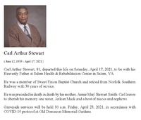 Stewart, Carl A, 1939 - 2021 Carl Arthur Stewart was born on June 12, 1939 to Annie Murl Stewart Smith. He is survived by his sister, Jerlean Mack. Carl Stewart died on April 17, 2021, and is buried in Old Dominion Memorial Gardens. He lived in Salem.