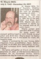 Mills, W. Wayne, 1949 - 2021 W. Wayne Mills was born in Roanoke in 1949 to Ralph and Mary Mills. He married Karen. He had one son, Tommy Mills. Wayne Mills died on December 20, 2021, and is buried in Old Dominion Memorial Gardens.