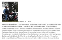 Pankey, Alexander Leslie, Jr., 1960 - 2021 Alexander Leslie Pankey, Jr. was born on April 28, 1960 to Alexander L. Pankey Sr. and Shirley Mae Pankey Terry. He married Teresa Ann Johnson Pankey. They had three children: Daisy Michelle Pankey, Jonathan F. Johnson and Tiffany N. Johnson. Alexander Pankey, Jr. died on June 4, 2021, and is buried in Old Dominion Memorial Gardens. He lived in Buchanan.