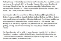 Bishop, Audrey Geraldine, 1931 - 2022 Audrey Bishop was born in 1931 in Roanoke to Joseph and Clara St. Clair. She married Nelson Bishop. They had two children, Steven and Douglas. Audrey Bishop died on June 22, 2022, and is buried in Old Dominion Memorial Gardens. She lived in Blue Ridge.