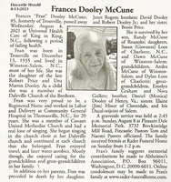 McCune, Frances Dooley, 1935 - 2021 Frances "Fran" Dooley McCune was born in Troutville on December 13, 1935 to Robert Price and Una Martin Dooley. She had four children: Janet Rogers, Randy McCune, Susan Looz, and Dawn McCune. Frances McCune died on August 4, 2021, and is buried in Pleasant Dale Memorial Park.
