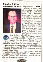 Cline, Stanley R, 1930 - 2021 Stanley R. Cline was born on November 23, 1930 to David and Mae Cline. He had three brothers: Olin, Harold, and Nelson. He married Mary Bell Cline. Stanley Cline died on September 6, 2021, and is buried in Old Dominion Memorial Gardens. He lived in Roanoke