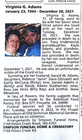Adams, Virginia G, 1944 - 2021 Virginia Adams was born in 1944. She married Gerald W. Adams. She had six children: Tracy Underwood, Frankie Darrell Underwood, Rebecca "Janie" Davis, Kathy McClung, Gerald Adams Jr, and Randy Adams. Virginia Adams died on December 28, 2021, and is buried in Old Dominion Memorial Gardens. She lived in Hardy, Virginia.
