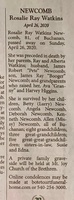 Newcomb, Rosalie Ray Watkins, 1939 - 2020 Rosalie Ray Watkins Newcomb was born in 1939 to Ray and Alberta Watkins. She married James Robert "Pete" Newcomb. They had six children: James Ray "Booger", Betty, Angela, Deborah, Kenneth, and Allen. Rosalie Newcomb died on April 26, 2020, and is buried in Mt. Joy Church of the Brethren. She lived in Buchanan.