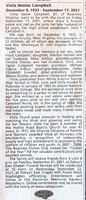 Campbell, Viola Nester, 1933 - 2021 Viola Nester Campbell was born on December 9, 1933 in Monroe County, West Virginia to Rev. Montague O. and Virginia Huffman Nester. She married John F. Campbell Jr. They had two children, Marilyn Harden and John Floyd Campbell. Viola Campbell died on September 17, 2021, and is buried in Old Dominion Memorial Gardens. She lived in Roanoke.