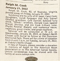 Cook, Ralph Monroe, 1939 - 2022 Ralph took was born in 1939 to Herman and Mildred Cook. He married Carol Cook. They had two children, Cyndi Ferguson and Amy Darnell. Ralph Cook died on January 21, 2022, and is buried in Old Dominion Memorial Park. He lived in Roanoke.